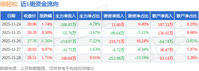 资金流向数据方面,本周倍轻松主力资金合计净流出260.48万元,游资资金合计净流出110.02万元,散户资金合计净流入370.5万元。本周资金流向一览见下表: