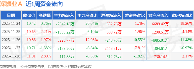 资金流向数据方面,本周深振业A主力资金合计净流出6273.22万元,游资资金合计净流入2852.77万元,散户资金合计净流入3420.44万元。本周资金流向一览见下表: