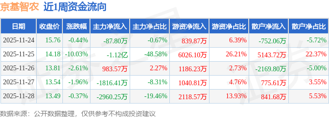 资金流向数据方面,本周京基智农主力资金合计净流出1.51亿元,游资资金合计净流入1.12亿元,散户资金合计净流入3839.14万元。本周资金流向一览见下表: