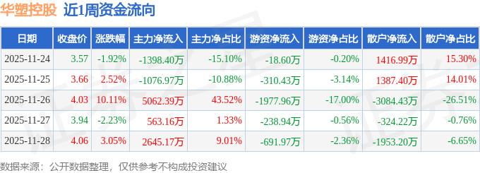 资金流向数据方面,本周华塑控股主力资金合计净流入5795.36万元,游资资金合计净流出3237.9万元,散户资金合计净流出2557.46万元。本周资金流向一览见下表: