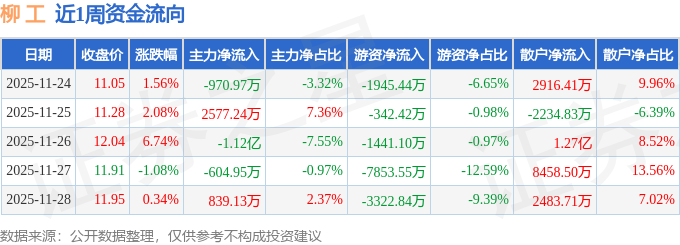 资金流向数据方面,本周柳 工主力资金合计净流出9374.99万元,游资资金合计净流出1.49亿元,散户资金合计净流入2.43亿元。本周资金流向一览见下表:
