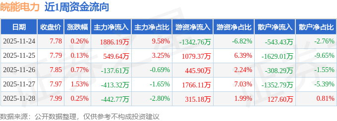 资金流向数据方面,本周皖能电力主力资金合计净流入1442.12万元,游资资金合计净流入2263.8万元,散户资金合计净流出3705.92万元。本周资金流向一览见下表: