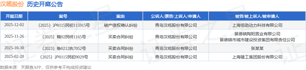 根据统计,近一年内以青岛汉缆股份有限公司为当事人的历史开庭公告有4则,其中案由为“买卖合同纠纷”的公告以3则居首,其次为“破产债权确认纠纷”有1则。历史开庭公告如下: