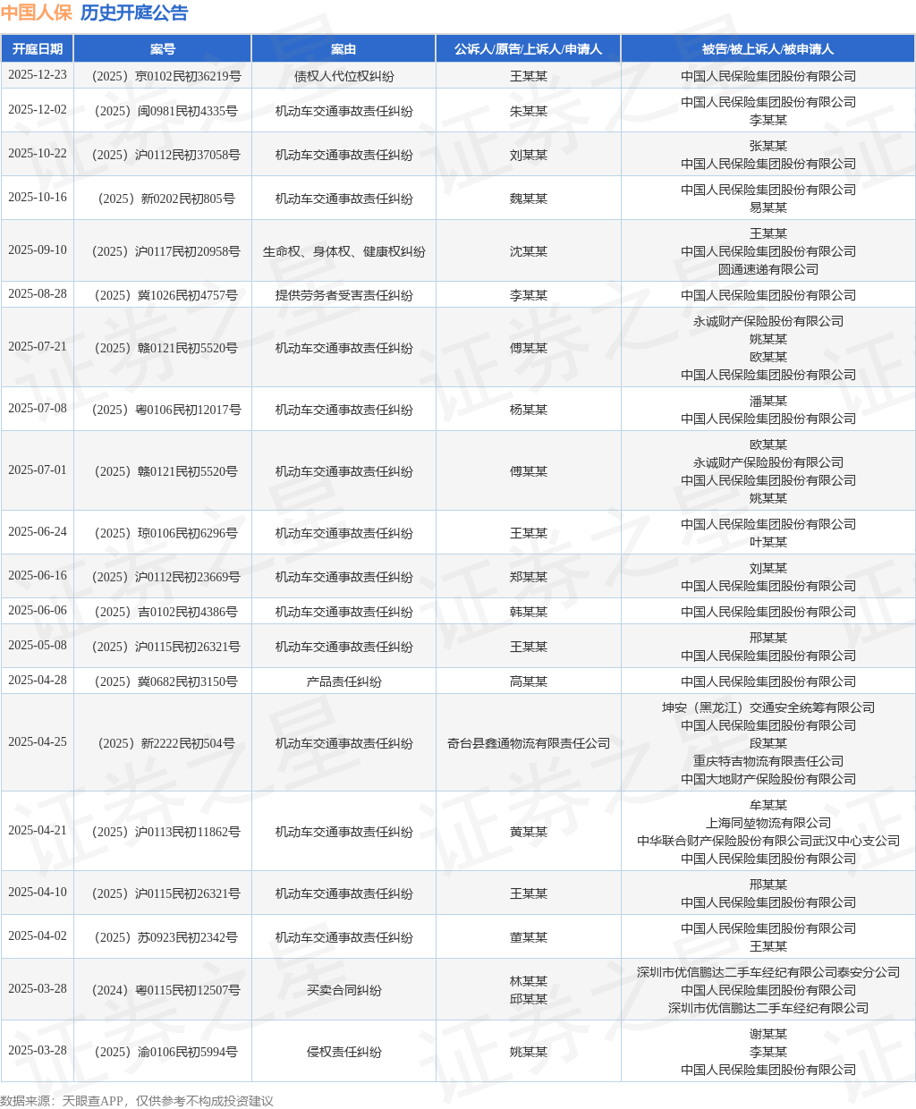 案号:(2025)闽0981民初4335号根据统计,近一年内以中国人民保险集团股份有限公司为当事人的历史开庭公告有27则,其中案由为“机动车交通事故责任纠纷”的公告以17则居首,其次为“买卖合同纠纷”有3则,“交通事故”有1则。历史开庭公告(前20条)如下: