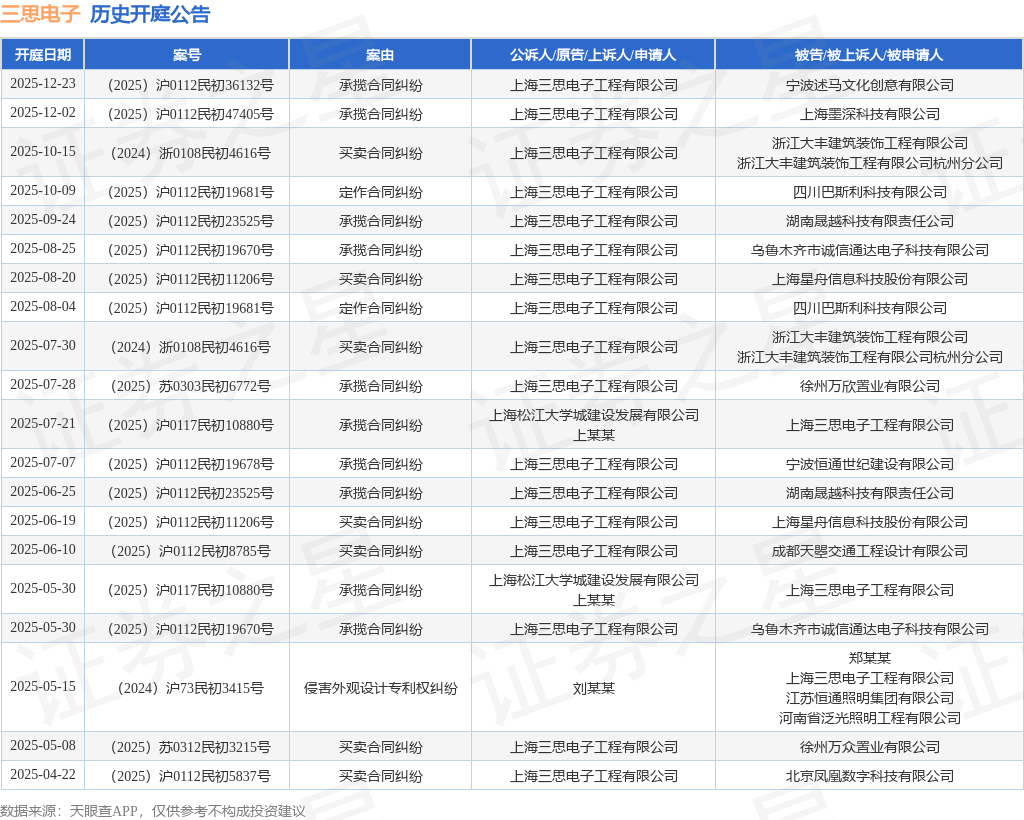 案号:(2025)沪0112民初47405号根据统计,近一年内以上海三思电子工程有限公司为当事人的历史开庭公告有25则,其中案由为“买卖合同纠纷”的公告以10则居首,其次为“承揽合同纠纷”有10则,“劳动合同纠纷”有2则。历史开庭公告(前20条)如下: