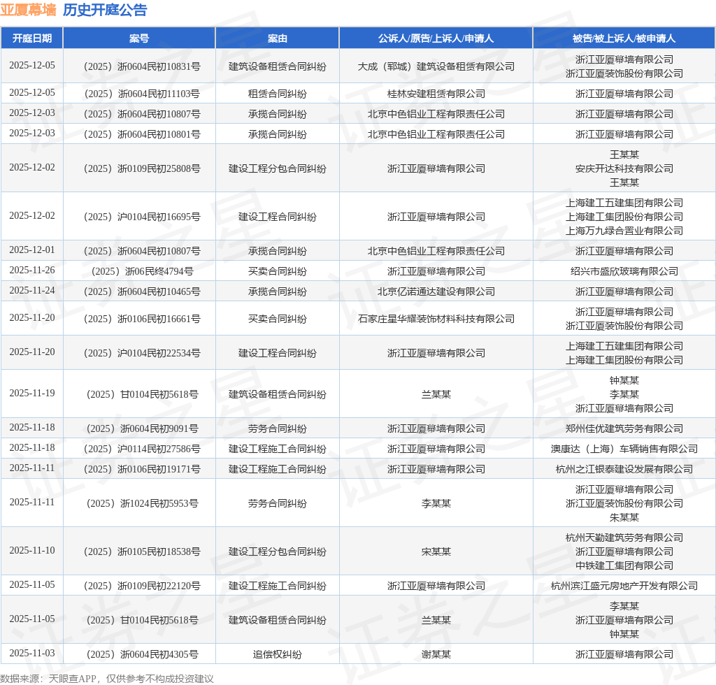 案号:(2025)沪0104民初16695号根据统计,近一年内以浙江亚厦幕墙有限公司为当事人的历史开庭公告有229则,其中案由为“建设工程施工合同纠纷”的公告以41则居首,其次为“买卖合同纠纷”有37则,“建设工程分包合同纠纷”有30则。历史开庭公告(前20条)如下: