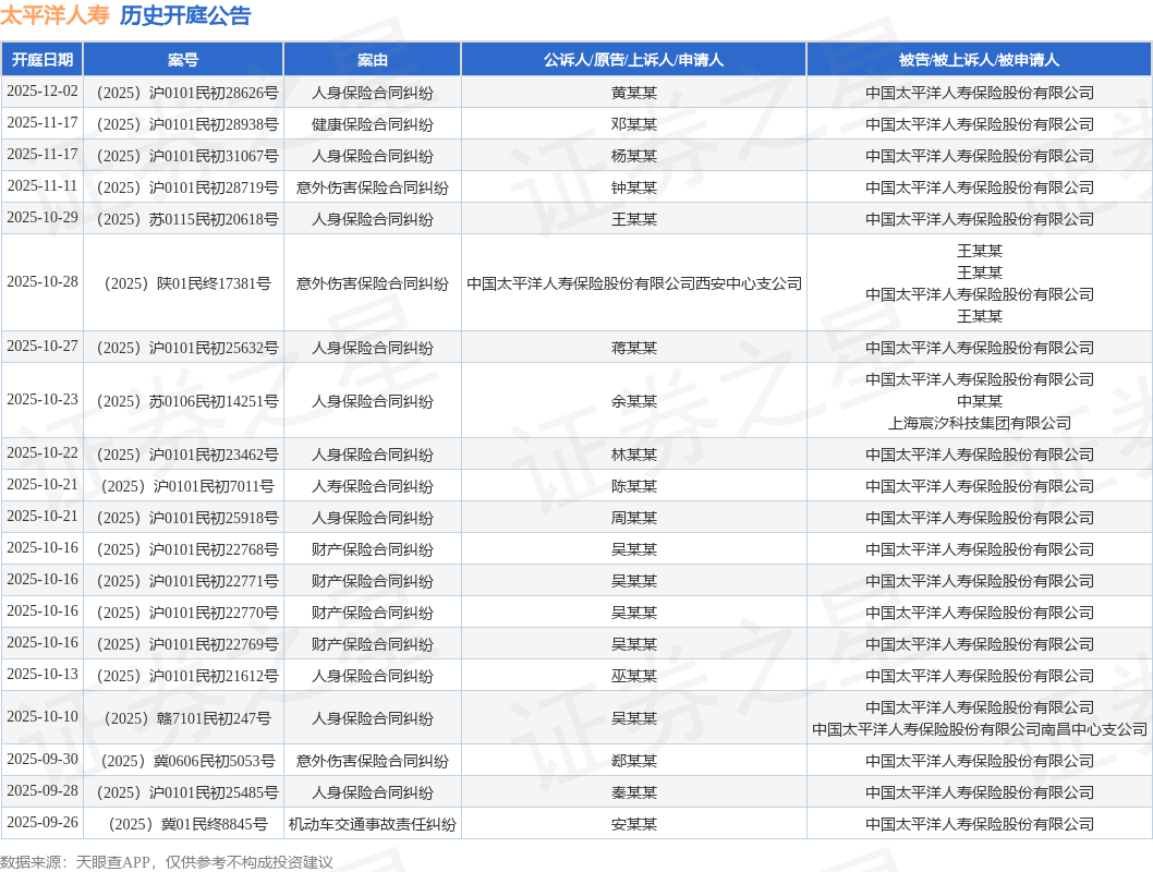 案号:(2025)沪0101民初28626号根据统计,近一年内以中国太平洋人寿保险股份有限公司为当事人的历史开庭公告有139则,其中案由为“人身保险合同纠纷”的公告以88则居首,其次为“意外伤害保险合同纠纷”有14则,“保险纠纷”有13则。历史开庭公告(前20条)如下: