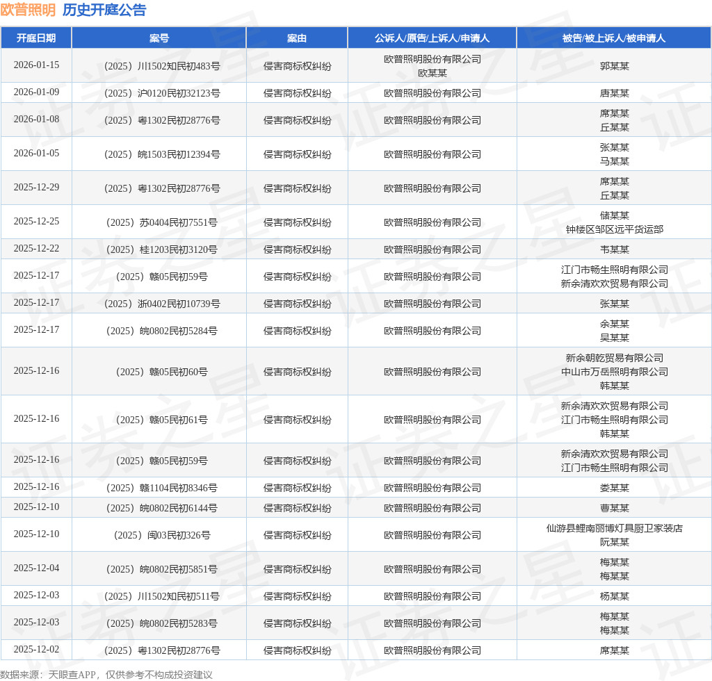 案号:(2025)粤1302民初28776号根据统计,近一年内以欧普照明股份有限公司为当事人的历史开庭公告有549则,其中案由为“侵害商标权纠纷”的公告以468则居首,其次为“侵害商标权”有24则,“商标权权属、侵权纠纷”有16则。历史开庭公告(前20条)如下: