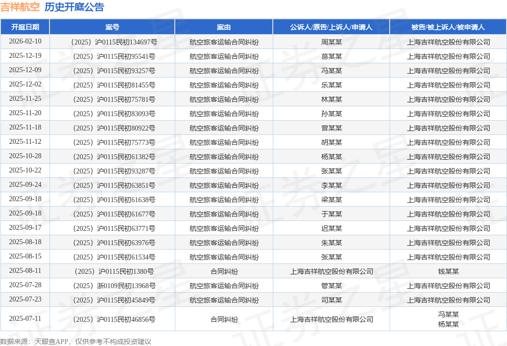 案号:(2025)沪0115民初81455号根据统计,近一年内以上海吉祥航空股份有限公司为当事人的历史开庭公告有52则,其中案由为“航空旅客运输合同纠纷”的公告以29则居首,其次为“劳动合同纠纷”有8则,“教育培训合同纠纷”有6则。历史开庭公告(前20条)如下: