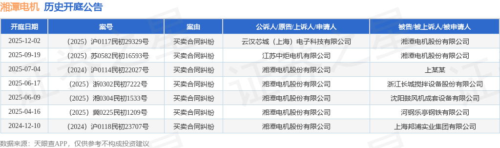 根据统计,近一年内以湘潭电机股份有限公司为当事人的历史开庭公告有7则,其中案由为“买卖合同纠纷”的公告以7则居首。历史开庭公告如下: