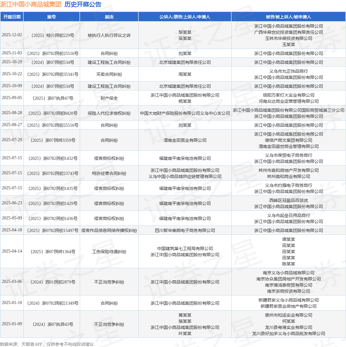 案号:(2025)桂01民初229号根据统计,近一年内以浙江中国小商品城集团股份有限公司为当事人的历史开庭公告有19则,其中案由为“侵害商标权纠纷”的公告以4则居首,其次为“合同纠纷”有4则,“不正当竞争纠纷”有2则。历史开庭公告如下: