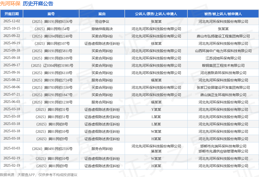 案号:(2025)冀0191民初6556号根据统计,近一年内以河北先河环保科技股份有限公司为当事人的历史开庭公告有24则,其中案由为“证券虚假陈述责任纠纷”的公告以10则居首,其次为“买卖合同纠纷”有7则,“服务合同纠纷”有3则。历史开庭公告(前20条)如下:
