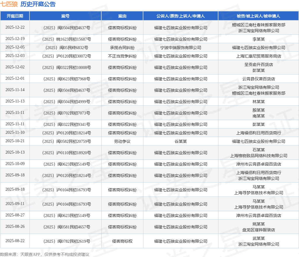 案号:(2025)闽0322民初10008号根据统计,近一年内以福建七匹狼实业股份有限公司为当事人的历史开庭公告有151则,其中案由为“侵害商标权纠纷”的公告以130则居首,其次为“不正当竞争纠纷”有11则,“承揽合同纠纷”有5则。历史开庭公告(前20条)如下: