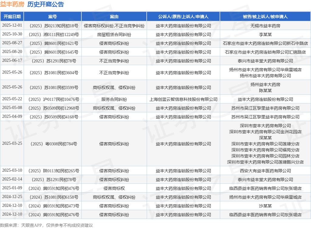 案号:(2025)苏0213知民初18号根据统计,近一年内以益丰大药房连锁股份有限公司为当事人的历史开庭公告有17则,其中案由为“侵害商标权纠纷”的公告以8则居首,其次为“商标权权属、侵权纠纷”有3则,“不正当竞争纠纷”有2则。历史开庭公告如下: