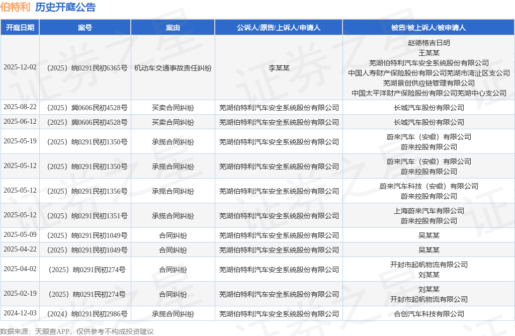 案号:(2025)皖0291民初6365号根据统计,近一年内以芜湖伯特利汽车安全系统股份有限公司为当事人的历史开庭公告有12则,其中案由为“承揽合同纠纷”的公告以5则居首,其次为“合同纠纷”有4则,“买卖合同纠纷”有2则。历史开庭公告如下:
