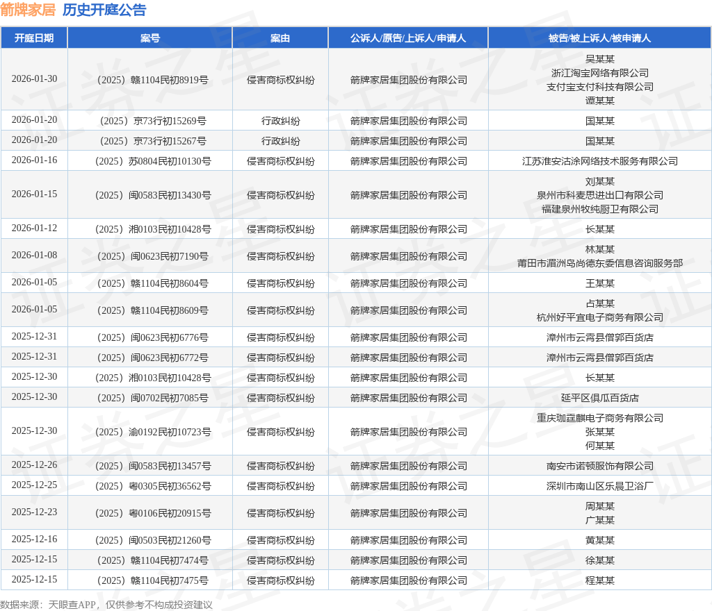 案号:(2025)赣1104民初8349号根据统计,近一年内以箭牌家居集团股份有限公司为当事人的历史开庭公告有488则,其中案由为“侵害商标权纠纷”的公告以427则居首,其次为“商标权权属、侵权纠纷”有19则,“行政纠纷”有8则。历史开庭公告(前20条)如下: