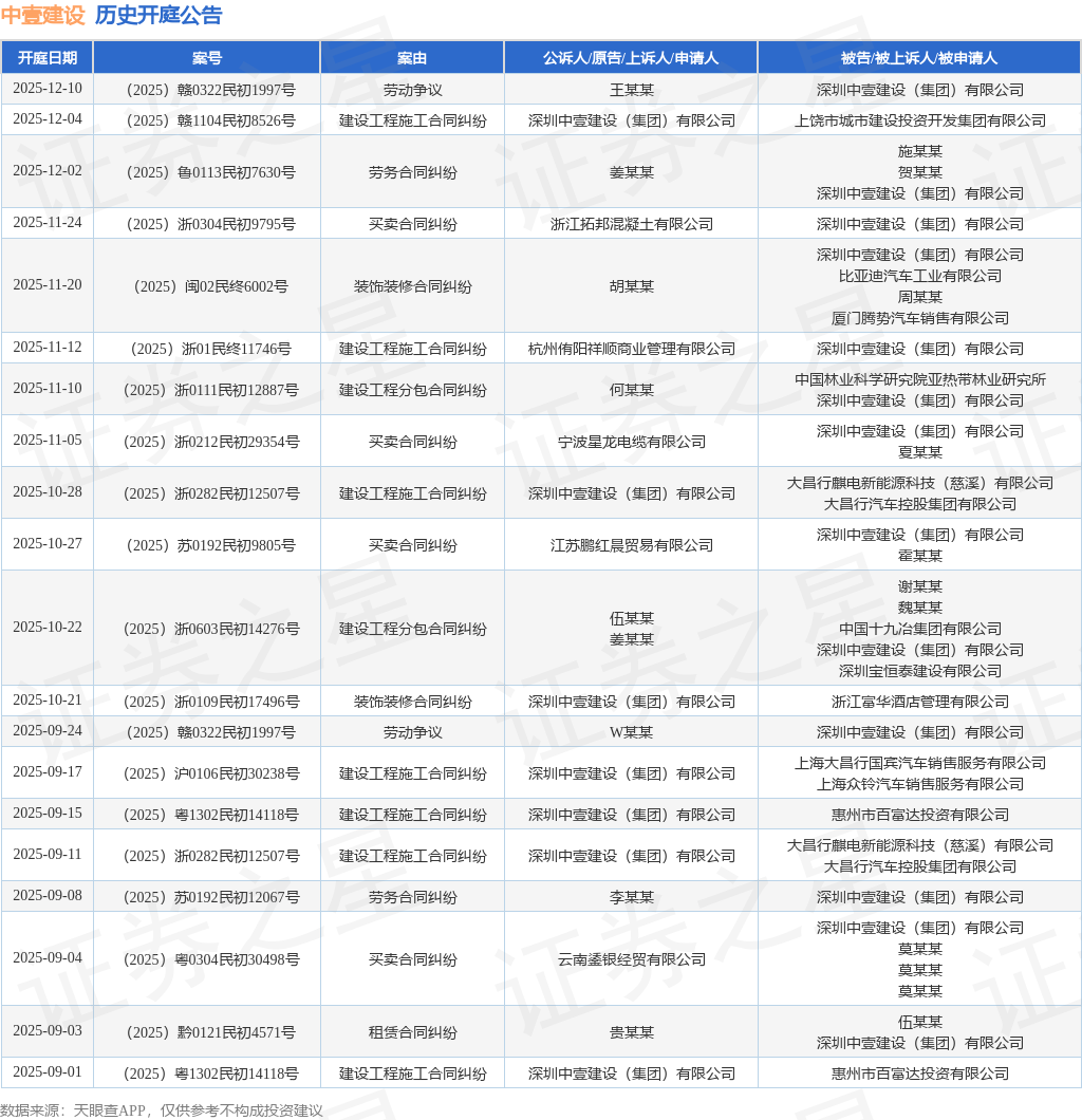案号:(2025)鲁0113民初7630号根据统计,近一年内以深圳中壹建设(集团)有限公司为当事人的历史开庭公告有78则,其中案由为“劳务合同纠纷”的公告以27则居首,其次为“买卖合同纠纷”有12则,“建设工程施工合同纠纷”有11则。历史开庭公告(前20条)如下: