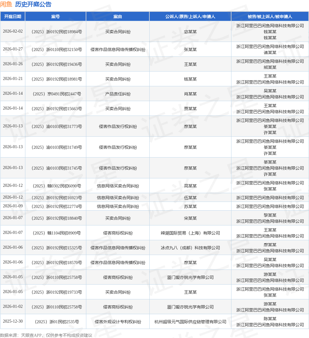 案号:(2025)浙01民终11348号根据统计,近一年内以浙江阿里巴巴闲鱼网络科技有限公司为当事人的历史开庭公告有772则,其中案由为“信息网络买卖合同纠纷”的公告以142则居首,其次为“网络服务合同纠纷”有121则,“侵害商标权纠纷”有110则。历史开庭公告(前20条)如下: