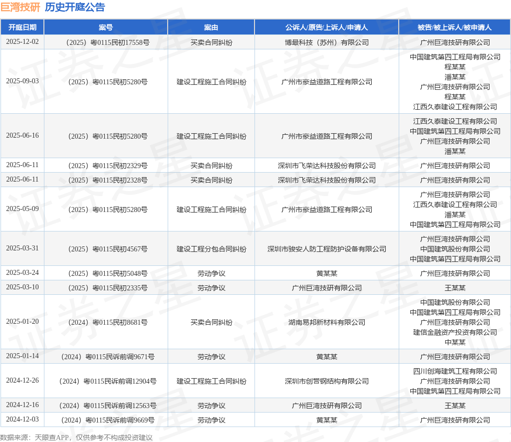 案号:(2025)粤0115民初17558号根据统计,近一年内以广州巨湾技研有限公司为当事人的历史开庭公告有14则,其中案由为“劳动争议”的公告以5则居首,其次为“买卖合同纠纷”有4则,“建设工程施工合同纠纷”有4则。历史开庭公告如下: