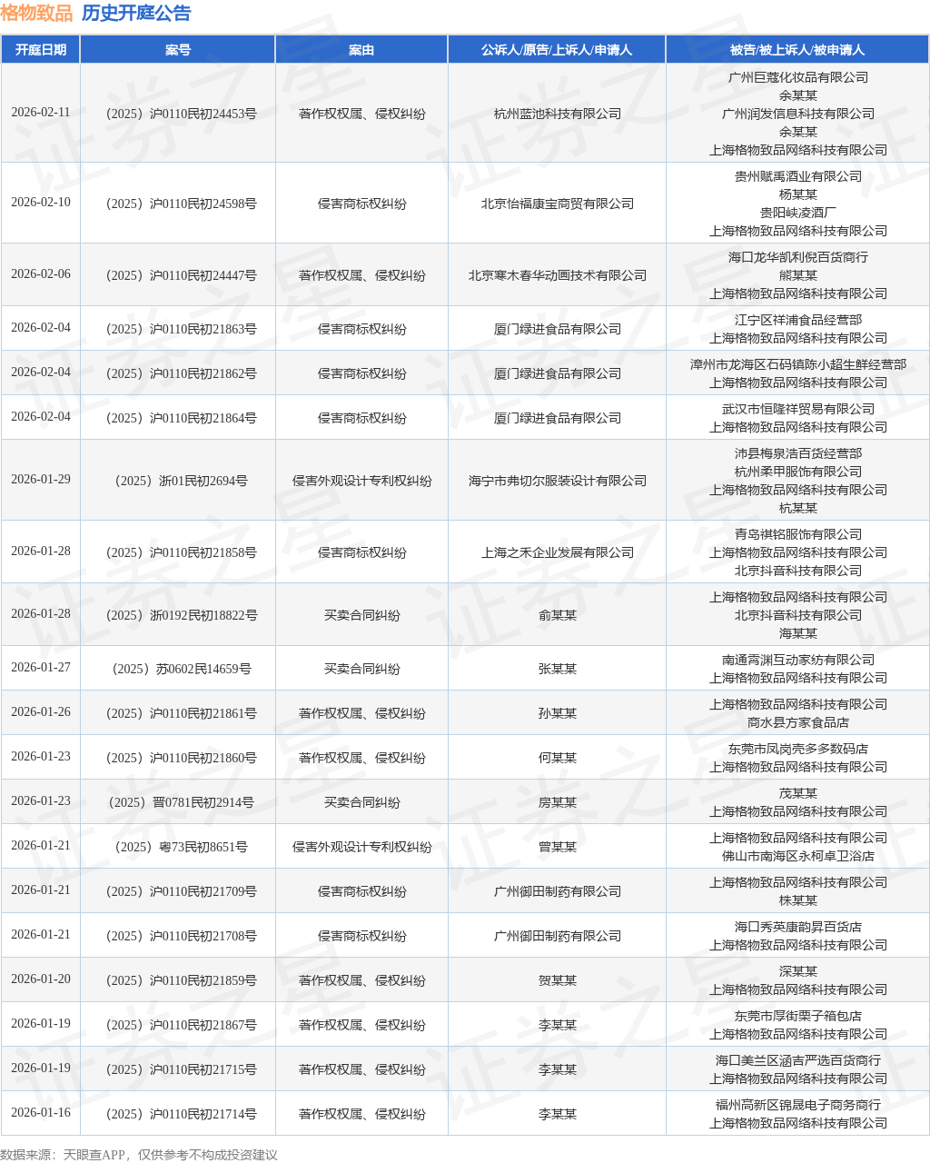 案号:(2025)闽0982民初4948号根据统计,近一年内以上海格物致品网络科技有限公司为当事人的历史开庭公告有3184则,其中案由为“侵害外观设计专利权纠纷”的公告以771则居首,其次为“侵害商标权纠纷”有641则,“著作权权属、侵权纠纷”有470则。历史开庭公告(前20条)如下: