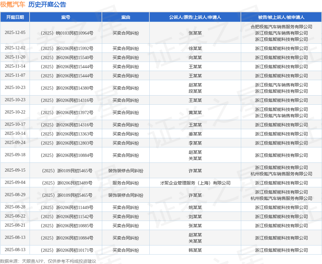案号:(2025)浙0206民初15992号根据统计,近一年内以浙江极氪智能科技有限公司为当事人的历史开庭公告有51则,其中案由为“买卖合同纠纷”的公告以32则居首,其次为“装饰装修合同纠纷”有8则,“服务合同纠纷”有3则。历史开庭公告(前20条)如下: