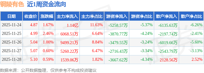 沪深股通持股方面,截止2025年11月28日收盘,铜陵有色深股通持股数为5.18亿股,占流通股比为492.0%。