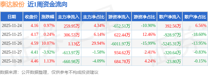 资金流向数据方面,本周泰达股份主力资金合计净流入1.05亿元,游资资金合计净流出4422.65万元,散户资金合计净流出6126.16万元。本周资金流向一览见下表: