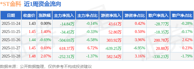 资金流向数据方面,本周*ST金科主力资金合计净流出187.93万元,游资资金合计净流入343.62万元,散户资金合计净流出155.69万元。本周资金流向一览见下表: