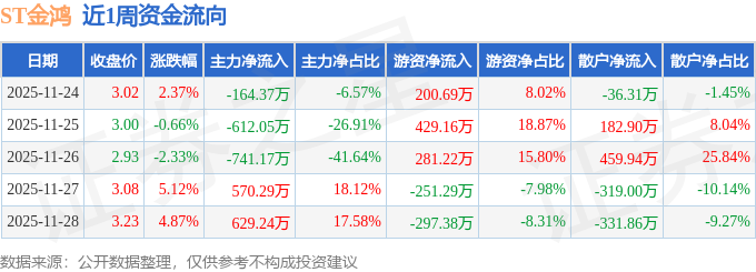 资金流向数据方面,本周ST金鸿主力资金合计净流出318.07万元,游资资金合计净流入362.4万元,散户资金合计净流出44.33万元。本周资金流向一览见下表: