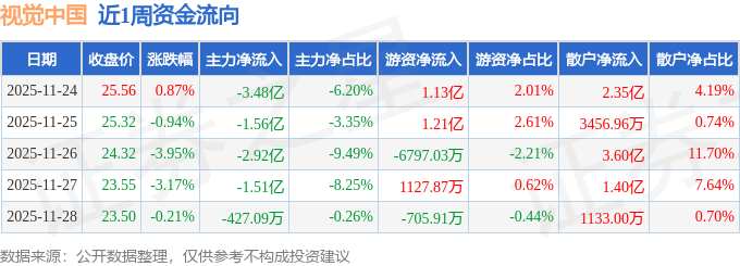 资金流向数据方面,本周视觉中国主力资金合计净流出9.51亿元,游资资金合计净流入1.7亿元,散户资金合计净流入7.8亿元。本周资金流向一览见下表: