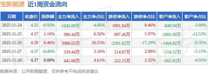 资金流向数据方面,本周宝新能源主力资金合计净流入4712.21万元,游资资金合计净流入644.6万元,散户资金合计净流出5356.81万元。本周资金流向一览见下表: