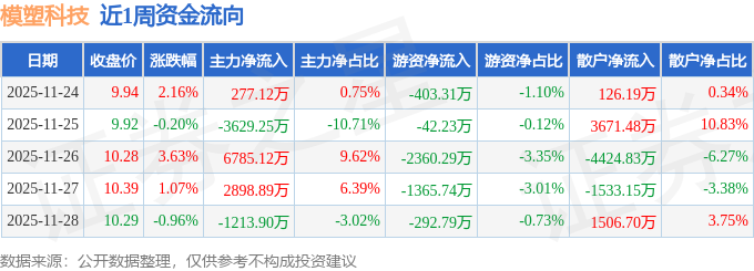 资金流向数据方面,本周模塑科技主力资金合计净流入5117.97万元,游资资金合计净流出4464.36万元,散户资金合计净流出653.62万元。本周资金流向一览见下表: