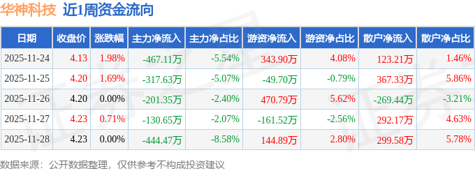 资金流向数据方面,本周华神科技主力资金合计净流出1561.2万元,游资资金合计净流入748.35万元,散户资金合计净流入812.85万元。本周资金流向一览见下表: