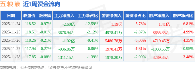 资金流向数据方面,本周五 粮 液主力资金合计净流出4.21亿元,游资资金合计净流入1.24亿元,散户资金合计净流入2.97亿元。本周资金流向一览见下表: