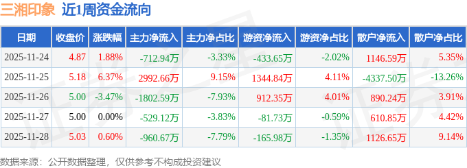 资金流向数据方面,本周三湘印象主力资金合计净流出1012.66万元,游资资金合计净流入1575.83万元,散户资金合计净流出563.17万元。本周资金流向一览见下表:
