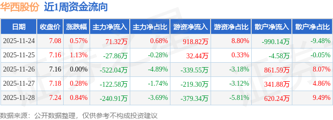 资金流向数据方面,本周华西股份主力资金合计净流出842.07万元,游资资金合计净流入13.09万元,散户资金合计净流入828.99万元。本周资金流向一览见下表: