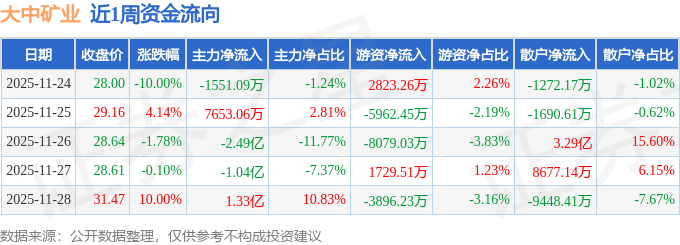 资金流向数据方面,本周大中矿业主力资金合计净流出1.58亿元,游资资金合计净流出1.34亿元,散户资金合计净流入2.92亿元。本周资金流向一览见下表: