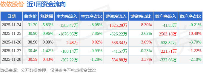 资金流向数据方面,本周依依股份主力资金合计净流出3840.3万元,游资资金合计净流入2028.73万元,散户资金合计净流入1811.57万元。本周资金流向一览见下表:
