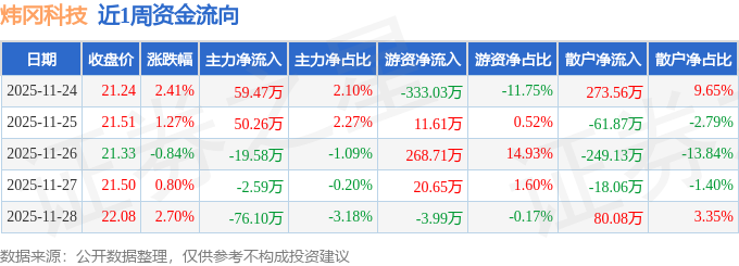 资金流向数据方面,本周炜冈科技主力资金合计净流入11.46万元,游资资金合计净流出36.05万元,散户资金合计净流入24.59万元。本周资金流向一览见下表:
