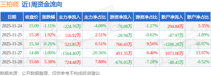 资金流向数据方面,本周三柏硕主力资金合计净流出425.91万元,游资资金合计净流入482.71万元,散户资金合计净流出56.8万元。本周资金流向一览见下表: