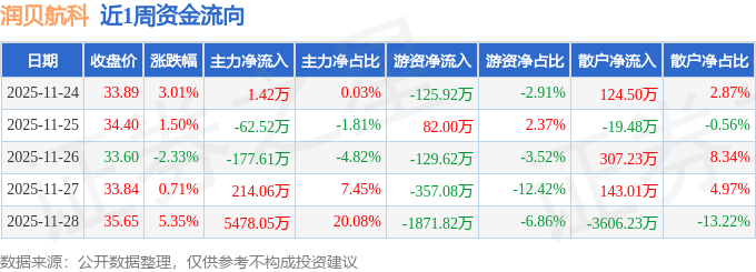 资金流向数据方面,本周润贝航科主力资金合计净流入5453.4万元,游资资金合计净流出2402.43万元,散户资金合计净流出3050.97万元。本周资金流向一览见下表: