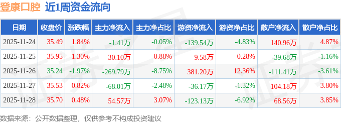 资金流向数据方面,本周登康口腔主力资金合计净流出254.55万元,游资资金合计净流入91.95万元,散户资金合计净流入162.6万元。本周资金流向一览见下表: