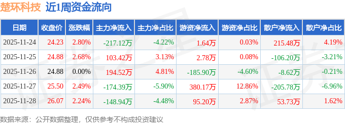 资金流向数据方面,本周楚环科技主力资金合计净流出242.5万元,游资资金合计净流入293.89万元,散户资金合计净流出51.39万元。本周资金流向一览见下表: