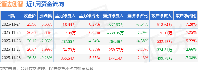 资金流向数据方面,本周通达创智主力资金合计净流入174.65万元,游资资金合计净流出937.43万元,散户资金合计净流入762.78万元。本周资金流向一览见下表: