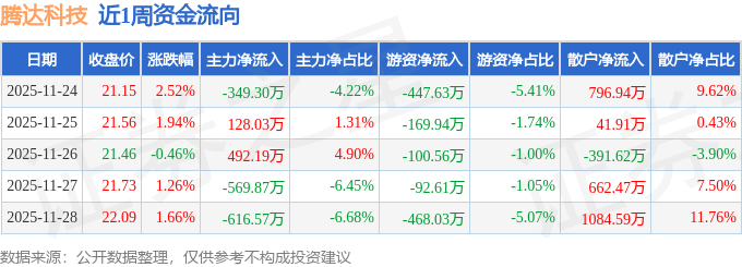 资金流向数据方面,本周腾达科技主力资金合计净流出915.52万元,游资资金合计净流出1278.77万元,散户资金合计净流入2194.29万元。本周资金流向一览见下表:
