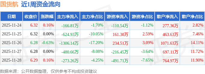 资金流向数据方面,本周国货航主力资金合计净流出2851.81万元,游资资金合计净流出422.89万元,散户资金合计净流入3274.7万元。本周资金流向一览见下表: