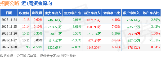 资金流向数据方面,本周招商公路主力资金合计净流出3165.39万元,游资资金合计净流入4144.2万元,散户资金合计净流出978.81万元。本周资金流向一览见下表: