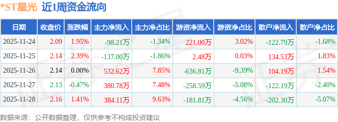 资金流向数据方面,本周*ST星光主力资金合计净流入1062.29万元,游资资金合计净流出853.73万元,散户资金合计净流出208.56万元。本周资金流向一览见下表: