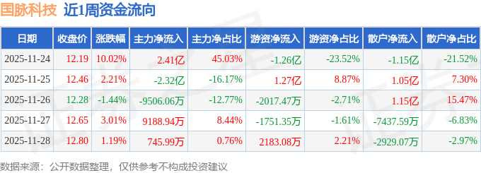 资金流向数据方面,本周国脉科技主力资金合计净流入1344.71万元,游资资金合计净流出1454.2万元,散户资金合计净流入109.49万元。本周资金流向一览见下表: