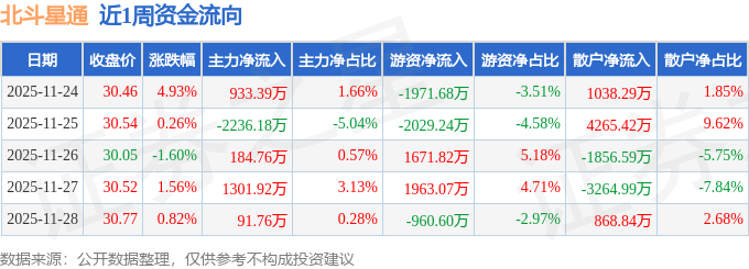 资金流向数据方面,本周北斗星通主力资金合计净流入275.66万元,游资资金合计净流出1326.63万元,散户资金合计净流入1050.97万元。本周资金流向一览见下表: